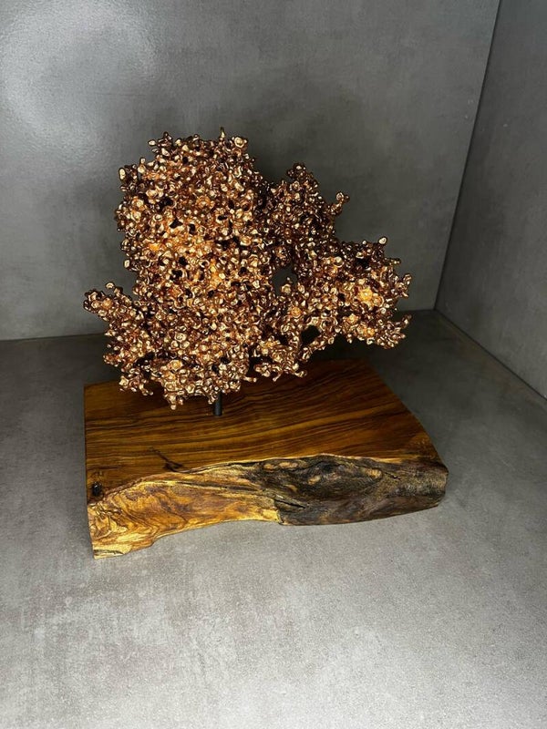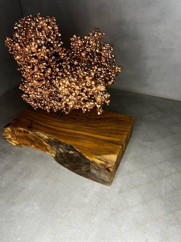 Il "Corallo in rame su base di ulivo" è un'opera d'arte che combina materiali naturali e tecniche artigianali per creare un pezzo unico e affascinante. Il corallo in rame, lavorato con cura, simula le forme organiche e sinuose del corallo marino, mentre la base in legno di ulivo aggiunge un tocco di calore e rusticità.